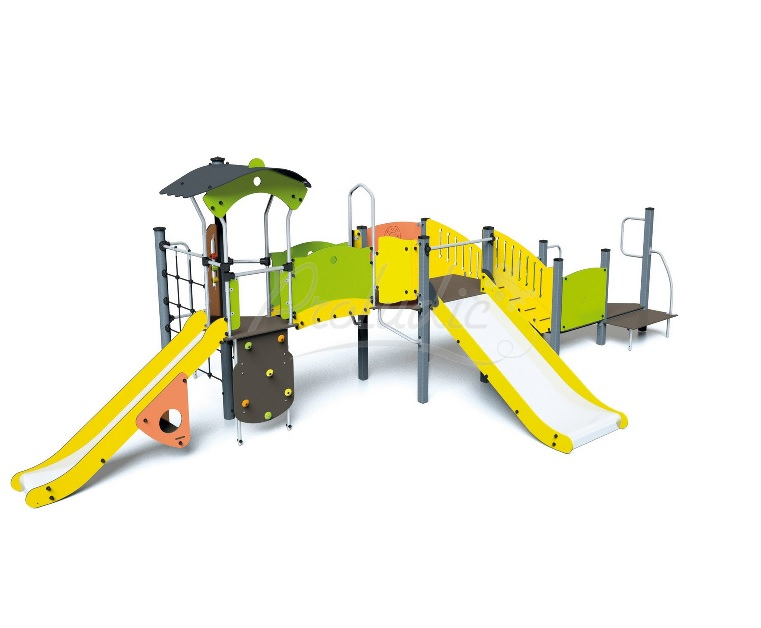 Urządzenie J38118 z serii Diabolo jest bardzo ciekawą propozycją łączącą ze sobą różne funkcje zabawowe. Zabawka posiada dwie zjeżdżalnie z których jedna może posłużyć do zjazdów w tandemie (zjazdy wykonane są z wysoko jakościowej stali nierdzewnej). Zabawę urozmaicą również ścianka oraz siatka wspinaczkowa. Na dodatek zabawka posiada kilka paneli zabawowych – w tym liczydełko (na placu zabaw nawet nauka liczenia może być frajdą!).
