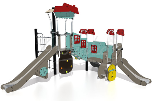 Urządzenie przystosowane jest tak aby najmłodsze dzieci mogły czuć i bawić się na nim bezpiecznie. Platformy zamocowane są na różnych wysokościach – 1,17m i 0,6m, a połączone są za pomocą schodków. Oczywiście zestaw wyposażony w zjeżdżalnię a nawet w dwie o różnych wysokościach startowych. Zestaw został rozbudowany o sieć i ściankę wspinaczkową. Na bocznej ściance schodków zamontowano panel zabawowy – pocztę . Na większej zjeżdżalni zamocowano panel zabawowy – zegar, na którym dzieci mogą ustawiać godzinę a następnie ją odczytać.