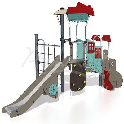 Atutem tego zestawu zabawowego są podesty i ścianki wspinaczkowe, które wykonane są z antypoślizgowego HPL, antypoślizgowe schodki z aluminium, które zapewnią stabilność i trwałość.